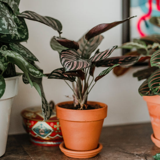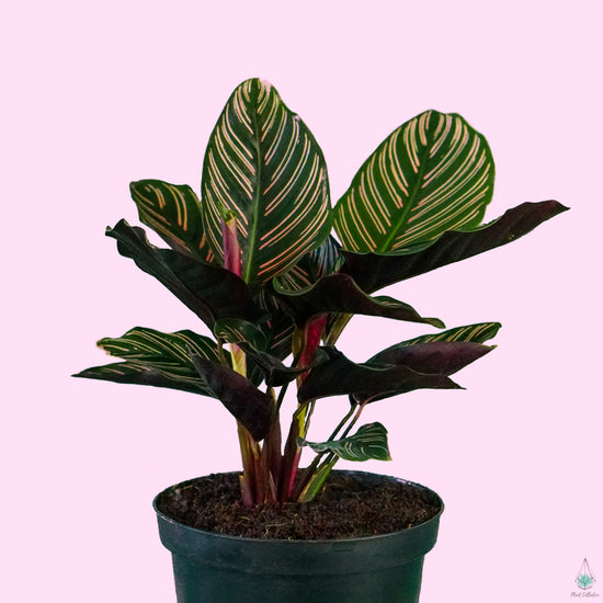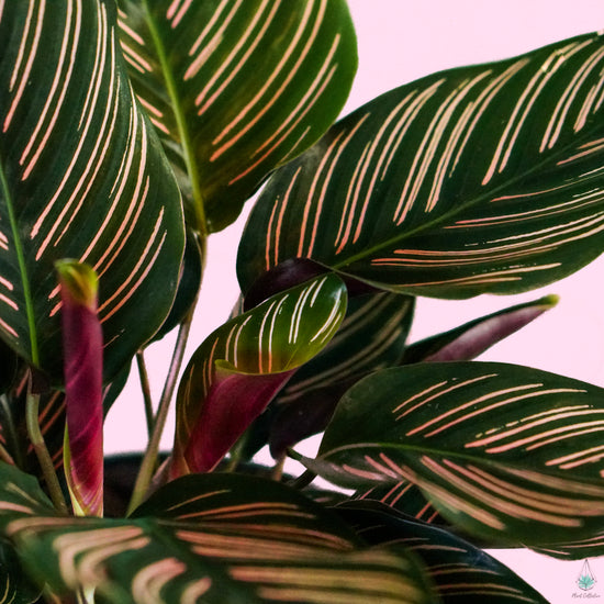 Calathea Ornata aka Pinstripe Plant or Pinstripe Calathea is known for its bold foliage - deep and dark green leaves which really help accentuate the pink stripes. Its leaves have a natural gloss to them, and their undersides are coloured a gorgeous deep purple-red, making this a true statement plant.